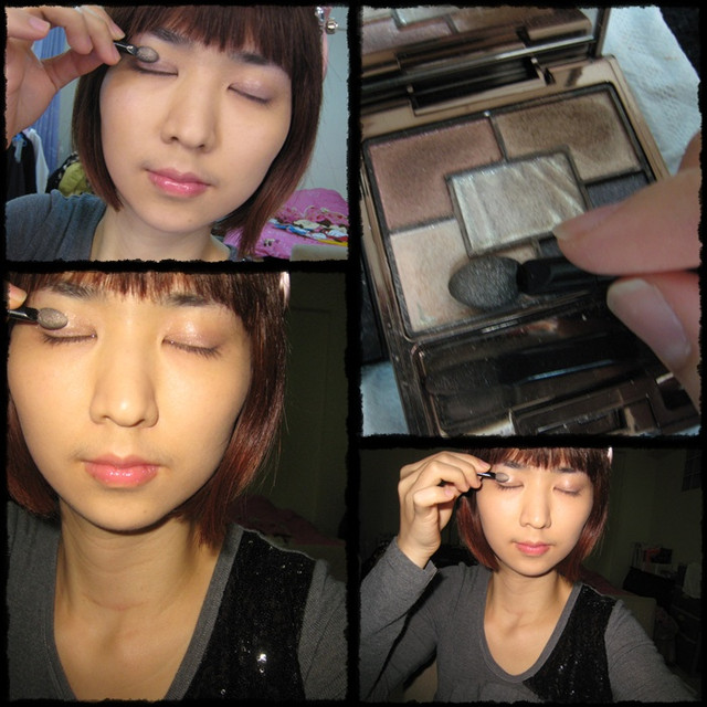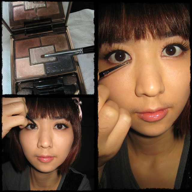 第二步~用細頭的眼影棒~沾取右上角咖啡色眼影~再靠近睫毛根部的地方畫上眼影!