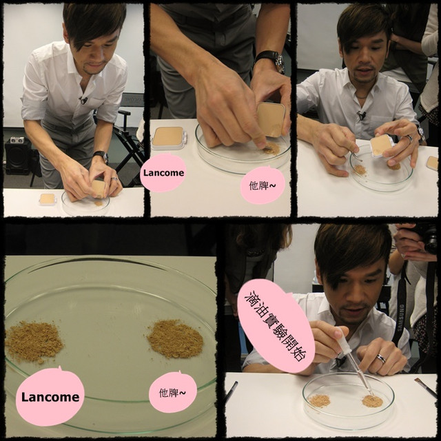意思是~如果用在臉上~臉出油之後~這款粉餅可以將多餘的皮脂吸附於粉末中~且粉體不會變色也不脫落~PS~注意看滴油後粉餅的顏色~LANCOME完全沒變色~它牌的已經暗沉無光澤囉!!