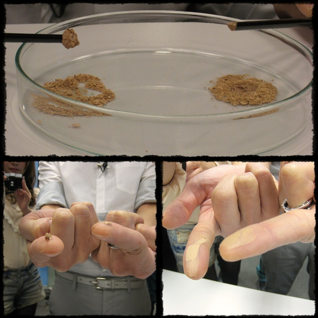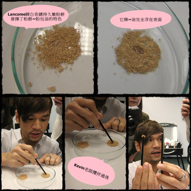 而另外一邊~實驗發現~粉餅無法吸附油脂~遇到油粉末變成粉底液~而造成脫妝~