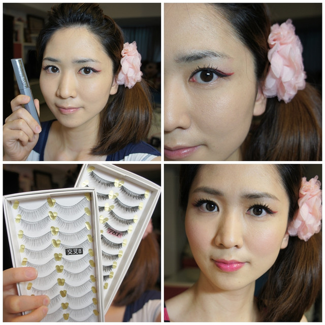 第一層使用交叉八款式做為基底,第二層 將781濃密款式的假睫毛先對半剪,再貼在眼中的位置